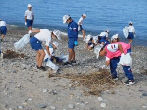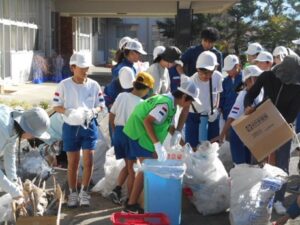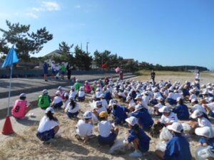 10月10日(金)、全校児童で石田小学校の伝統行事である石田浜清掃を行いました。縦割り班に分かれて、石田浜に落ちているゴミや流木などを協力しながら一生懸命に拾い集めました。お天気にも恵まれ、きれいな海の色と朝のさわやかな石田浜の様子に子供たちは、改めて石田浜を大切にしたいという思いを強くしながら活動していました。
