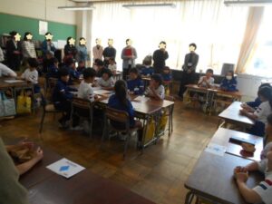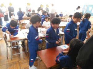 6年生の子供たちは「My best memories」について英語で一人一人発表しました。2年生は、お店屋さんとお客さんになり、「♡、☆、△、○・・・」などの形や大きさを英語で表現しながら、いろいろな形を集めてプリントに貼っていきました。