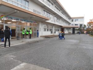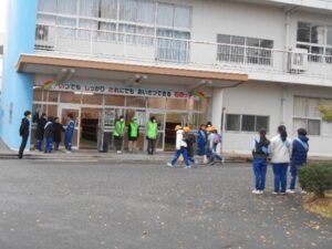 11月19日(水)、石田地区の民生児童委員協議会の方々と計画委員の児童、ボランティア参加児童が児童玄関の前で「あいさつ運動」を行いました。色とりどりの落ち葉が舞い、冷たい風がふく中、地域の方に見守られて、子供たちも嬉しそうな様子で、あいさつの声もいつも以上にはずんでいるようでした。