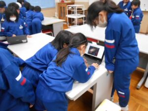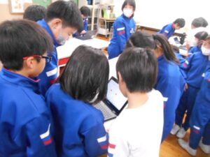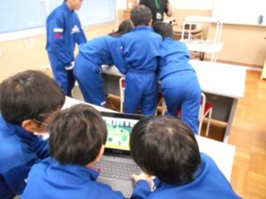 11月28日(金)、タブレット・写真クラブの児童が、クラブの時間に自分で作成したプログラミングの作品をほかの児童に楽しんでもらおうと、交流会を行いました。全校児童に放送で呼びかけ、大休憩の時間に集まった児童がいろいろな作品を試して楽しんでいました。「すごい!これ作ったん?」「むずかしいね!」などと話しながら、みんなでかわるがわるプログラミングの作品に挑戦していました。