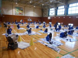 1月8日(木)、書き初め大会を行いました。1年「こうま」、2年「生きる」をクレパスで、3年「うめの花」、4年「美しい空」、5年「平和な海」、6年「新春の志」を書き初め用の大きな毛筆で揮毫しました。