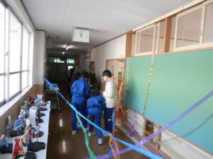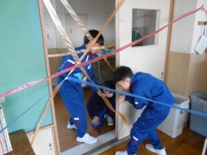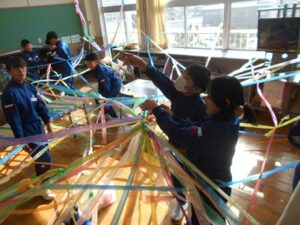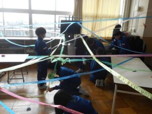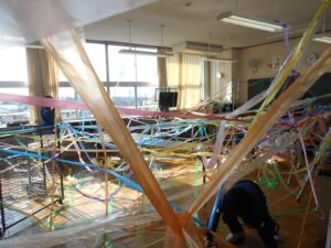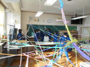 1月16日(金)、5年生が図画工作科、造形遊びの学習「この空間がいい感じ」を行いました。3階多目的室や近くの廊下などの空間を様々な色のテープを使って、思い思いにカラフルな空間をつくっていき、協力しながら自分たちの思う「いい感じ」にしていました。ダイナミックに大きな空間を彩っていく子供たちのエネルギーが感じられるひとときでした。