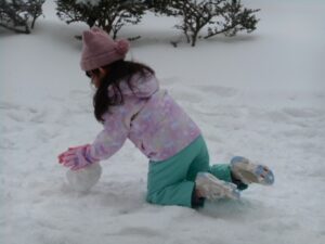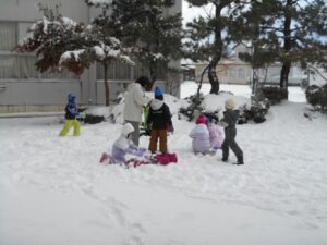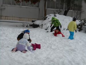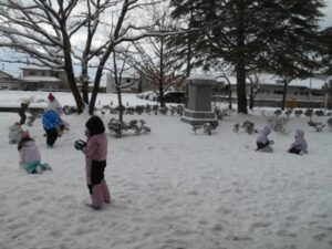 1月22日(木)、雪が積もり、1年生が前庭で雪遊びをしました。自分で身支度をして防寒具を身にまとい、ちょうど活動が始まる頃には雪もやみ、子供たちも大喜びでした。雪の上に寝てみたり、雪玉をつくったりと短い時間でしたが、とても楽しそうに雪に親しんでいました。