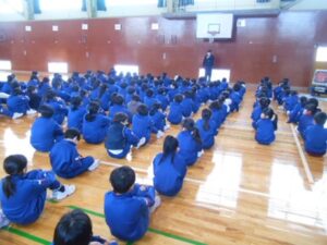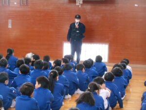 2月3日(火)、黒部警察署員にご協力いただき、不審な侵入者からの避難訓練を行いました。子供たちは、素早く、真剣に避難をすることができました。避難後には石田駐在所巡査から、自分たちの身を守る行動についてのお話を聞き、合い言葉「いかのおすし」の確認をしました。また、教職員も対応等についての研修を行い、助言をいただきました。